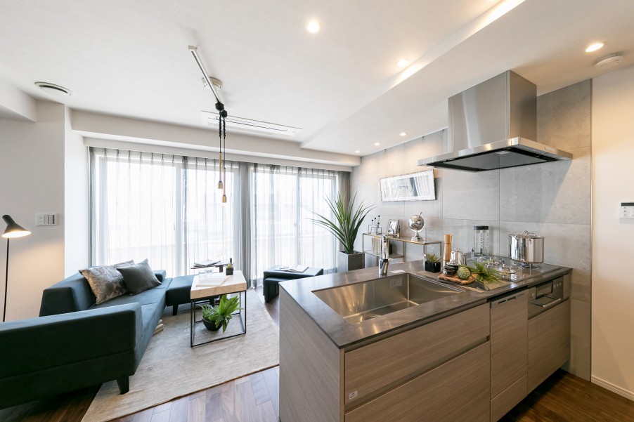 最上階で眺望が良いため、フラットカウンターキッチンにしてバルコニー側に向けました。もともとの間取りから大きく変更を加えていませんが、