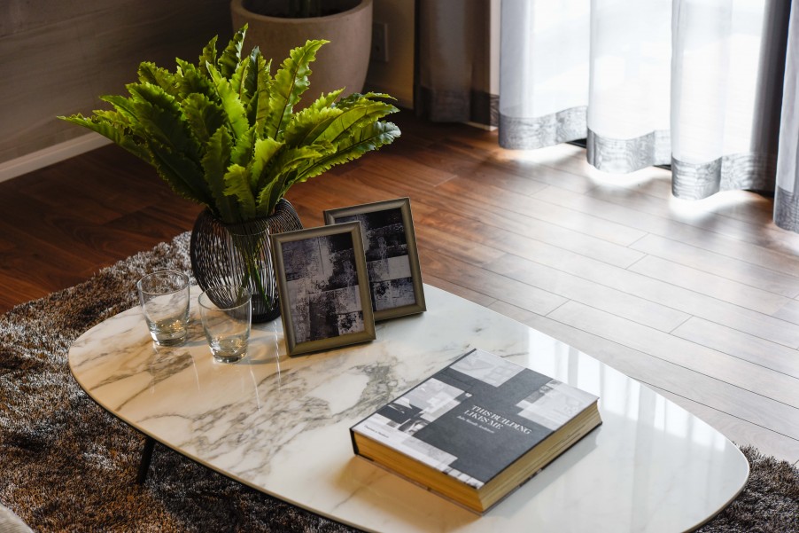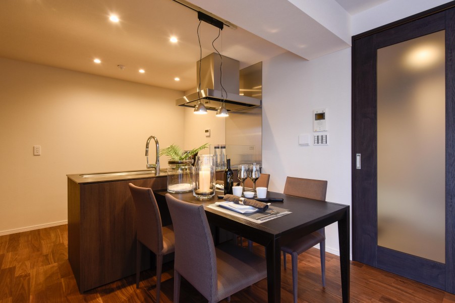 木調のフローリングを使ったリビングとのコントラストが出て、メリハリのある空間にしています。