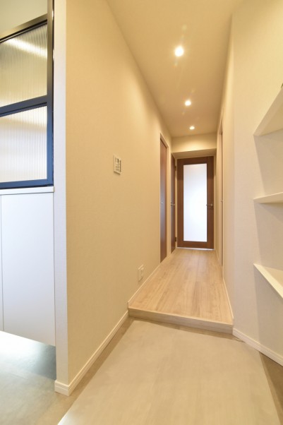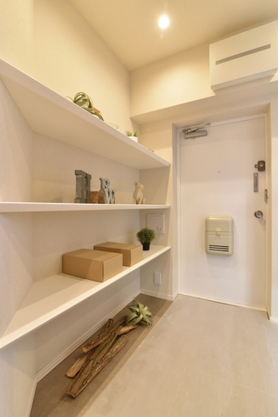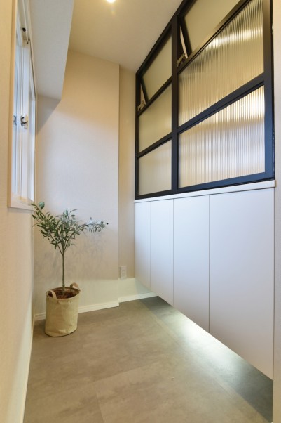 玄関ドアを開けると開放的な玄関スペースに、大型の見せる靴棚と隠せる靴棚の両方を配置、お子様用の自転車なども置ける広々とした空間を設けました。ウォークインクローゼットと物入で家族の荷物を収めるための収納力のあるリノベーションを行いました。