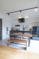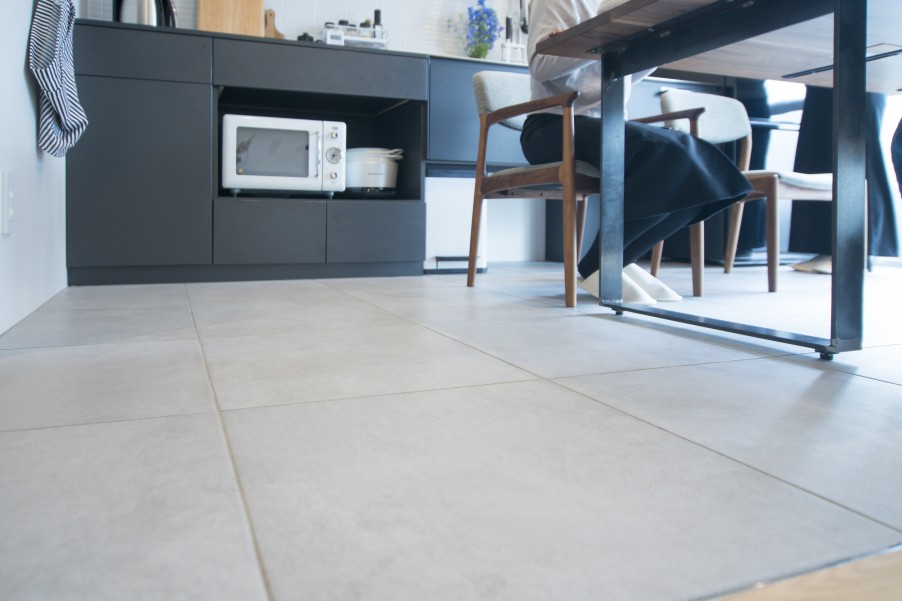 - 1質感を大切に素材選びキッチンは石タイル、リビングは無垢フローリング、天井壁は塗り壁をすることで質感を統一。