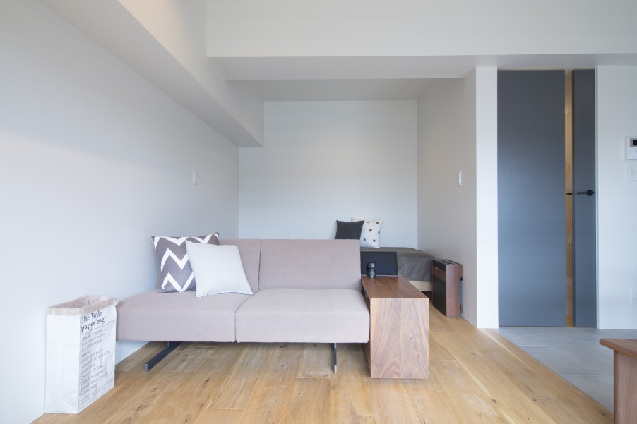 リビング横のベッドルームは壁を無くし、オープンにすることで狭さを解消しています。