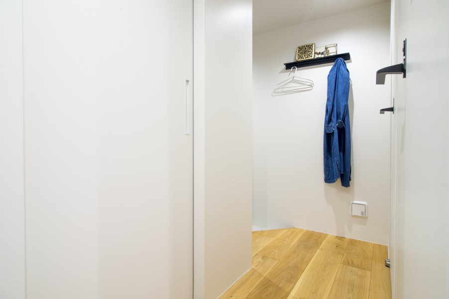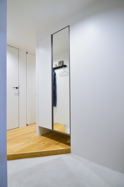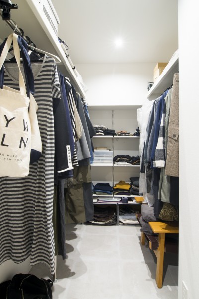 シートフローリングやフロアタイル、壁紙では出せない質感を表現しました。 - 2自分の持ち物に合わせた収納スペースお仕事の関係で、服や靴がたくさんある施主様。コの字型のウォークインは新居では必ず採用すると決めていました。ここにすべてを収納することで他に物を置かないようにできました。
