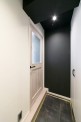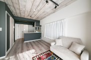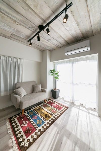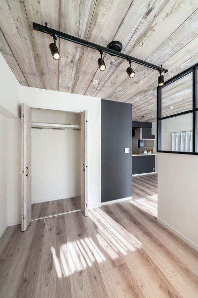 また、散らかりがちなワンルームの部屋も綺麗に片付くように下足用と物入れようの収納を造作しました。 - 3天井床の木の柄が部屋全体を優しい印象にします海外から仕入れたリアルな木目柄クロス。木目柄がアクセントとなるように白黒のモノトーンで居室をコーディネートしました。