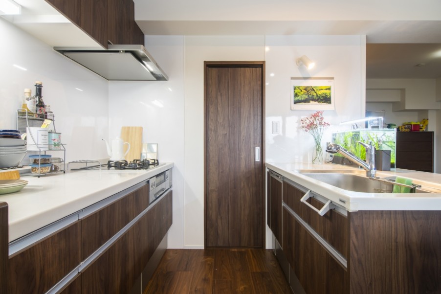 「これは、僕が提案しました。最初はキッチンの向きも違っていたんですが、変更してもらって、直接洗面室と行き来ができるようにしてもらったんです。家事をする場所の移動距離が少なくなって、かなり効率的だと思います」(ご主人)