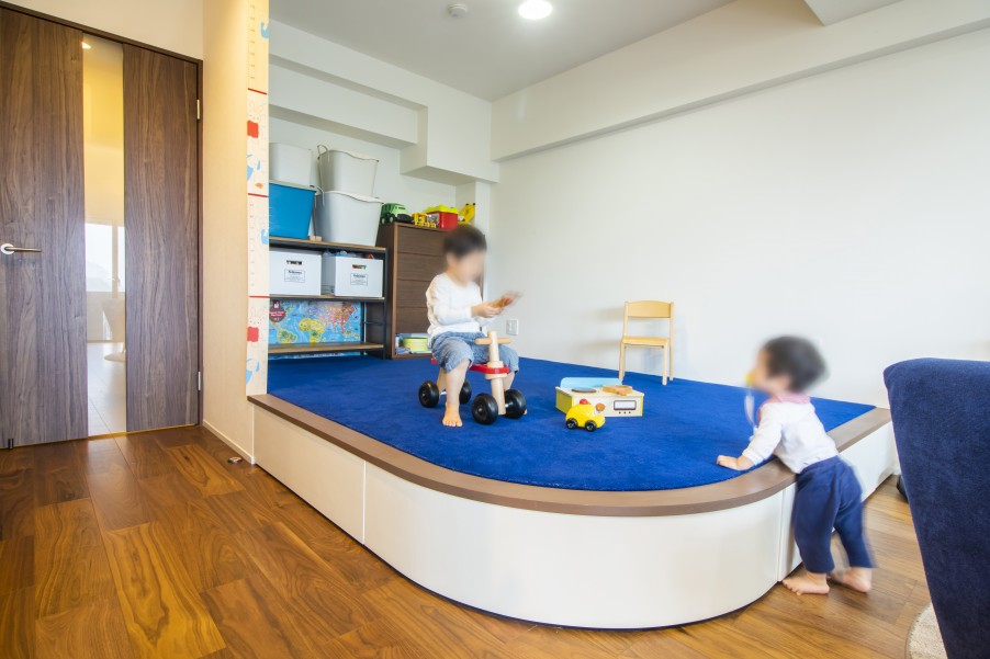 「共働きのため、毎日、忙しくなるのはわかっていたので、最初に伝えたのは、キッチンに立っていても、子どもたちを見ていられるようなリビングにしたいと伝えました。小上がり部分は、最初は部屋だったんですが、そこに壁を作ることで開放感がなくなってしまうと感じたので、思い切って、リビングの一部に取り入れました。下に引き出しをつけてもらって、収納スペースにしたので、かなり有効利用ができていると思います。また、畳ではなく、青いじゅうたんにして、ソファと色合いを合わせたのも良かったと思います。とはいえ、デザインよりも住みやすさを重視しました。解放感のある部屋で、緑あふれる借景が楽しめるのが何よりです」(奥様)