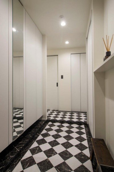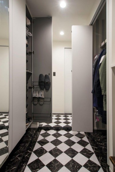 「最初は玄関だけの予定だったんですけど、日本のマンションは段差も少ないし、つなげたほうが一体感が出るかと思って、広げました。元になったインスタは石のタイルでしたが、こちらは室内でも使うため柄を合わせてオーダーでお願いしました。実は今、長女は海外で仕事をしているのですが、そこを訪ねてもきちんと生活しているのに、生活感を感じさせない洗練されたお部屋が多くて、そういったものも取り入れたいと思ったんです。海外っぽさは出したかったですね。オーソドックスなデザインというより、外国のお部屋のような雰囲気で個性を出したかったんです」