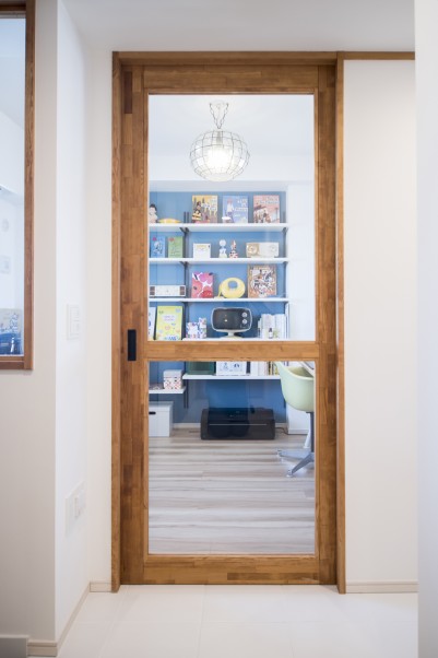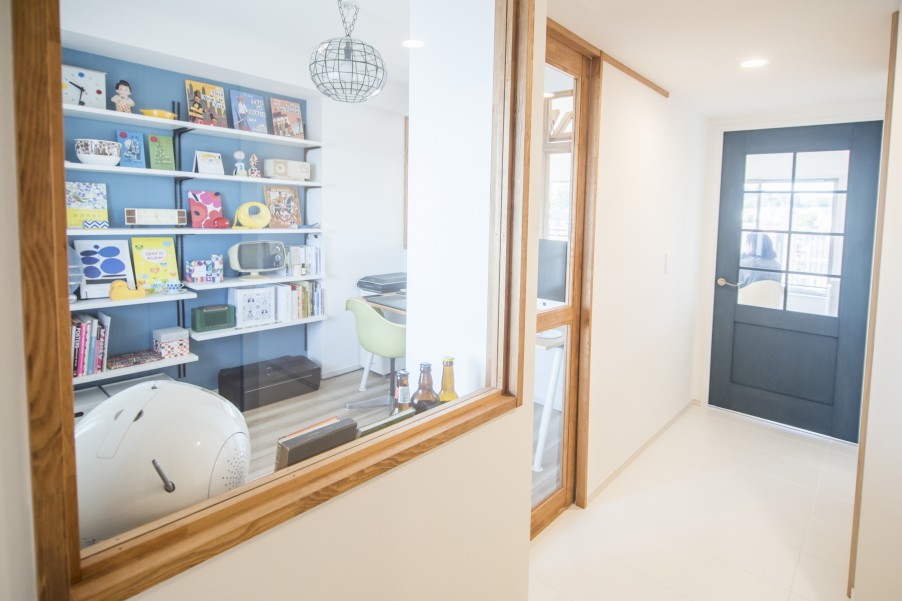 仕事部屋として使う予定の部屋は、東側にしか窓がなく、閉塞的な空間になりそうな造りでしたが、リビングとの間の壁に大きな室内窓を設け、陽光がたっぷり差し込む部屋へと生まれ変わらせました。