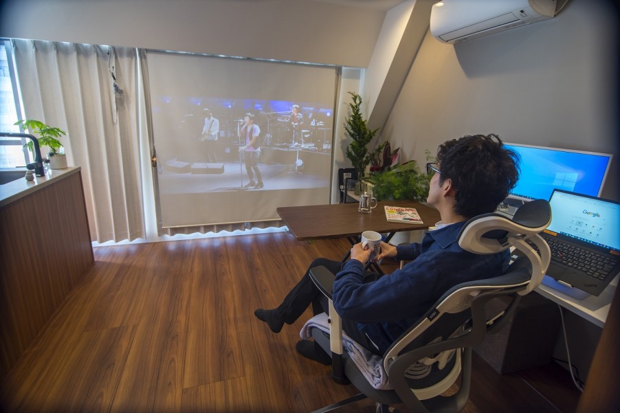 窓にはカーテンの代わりにロールスクリーンをかけているのですが、それをスクリーン代わりにして、プロジェクターでライブ番組や映画を楽しむこともあると言います。大きな画面で見る映像は迫力があり、おうち時間の楽しみの一つにもなっているようです。