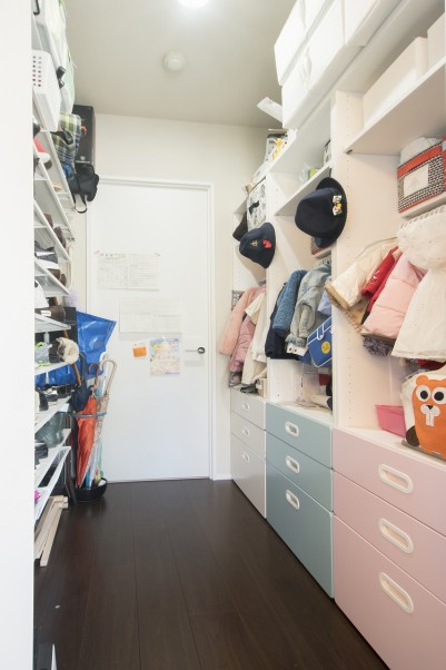 工事着工は新型コロナウイルスによる緊急事態宣言が明けてからとなり、スピード感重視で工事を進め、8月中旬に引っ越すことができました。 - 2子供たちが元気に過ごせる工夫を随所に取り入れている「まずベビーカーの出し入れがしやすいように、元々ついていた下駄箱をはずして、玄関を広くしました。それと子供たちの洋服とシューズを収納できる子供用ウォークスルークローゼットを設置。