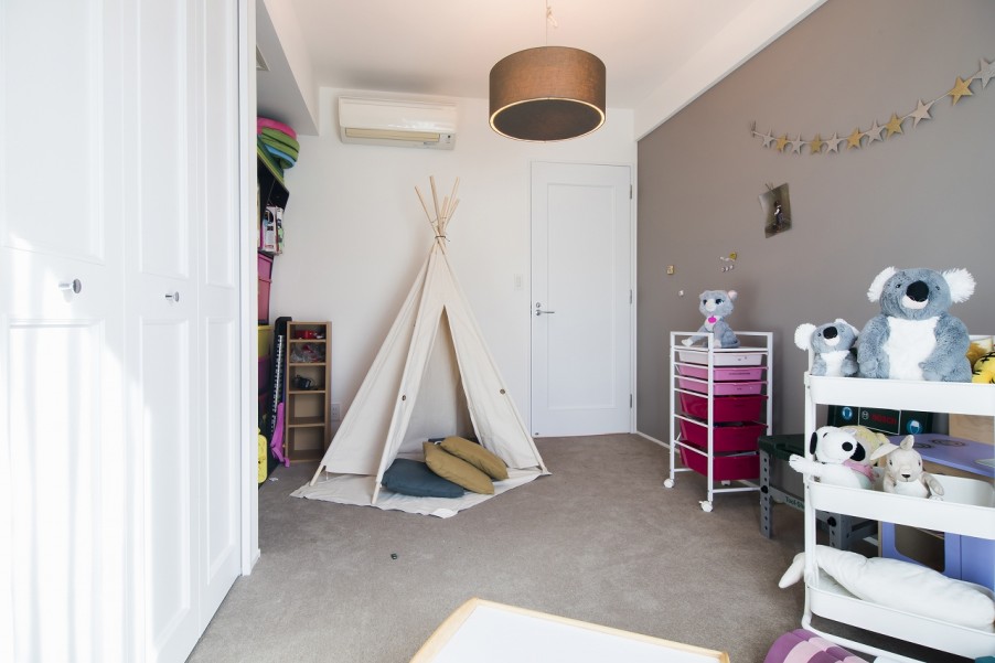 子供部屋はマグネット壁を採用し、お子さんの作品や学校関係のプリントを気軽に貼れるようにしています。まだまだ個々の部屋は不要な年齢ですが、成長とともに、それぞれの部屋も必要になってきます。