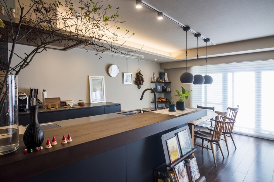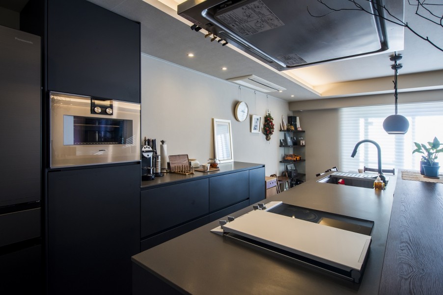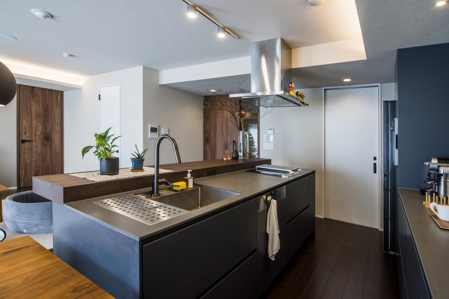 「キッチンにはスチームオーブンを入れたかったのと、広い木のカウンターをつけたかったんです。スペース的にもかなり広くとっていますし、キッチンから洗面所への出入りもできるようにしました。その分、リビングを削ることになりますが、子供たちも一緒に料理を手伝ったりしやすいので、キッチンスペースは余裕を持たせました。
