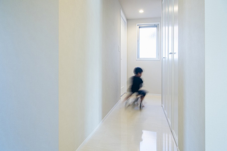 4歳のご長男と2歳のご長女は回遊できる家の廊下で、木製の三輪車に乗り回って遊んでいました。床が傷つかないのか心配になりましたが、