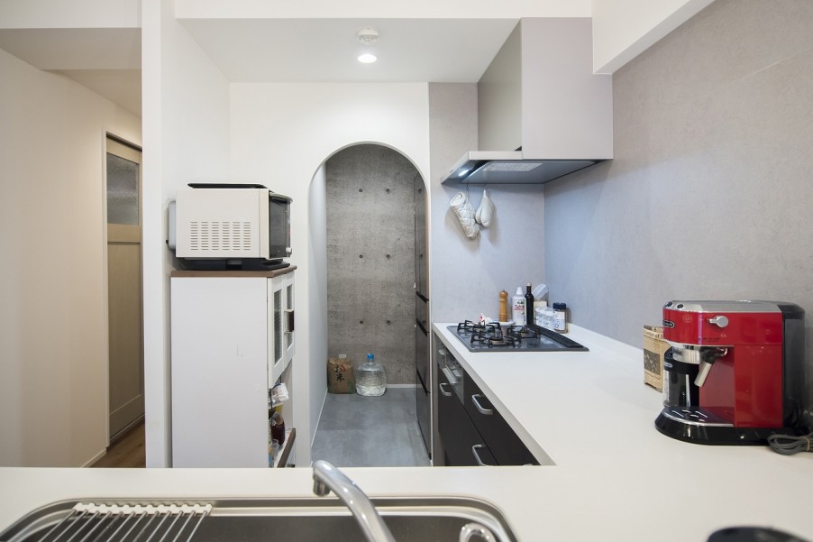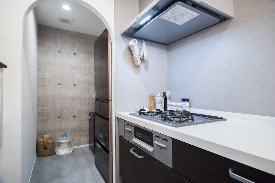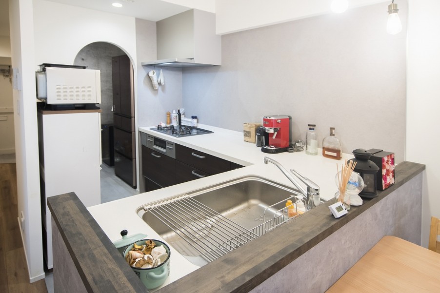 「最初は違う方向に向いていたんですが、リビングにいる子供の様子を見たいからということで、L字にしてもらったんです。おかげで作業スペースが広く取れて、使いやすくなりました。パントリーのアーチ状の入り口はインスタで見ていて、取り入れたいと思っていた要素なので、お願いしました」(奥様)