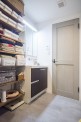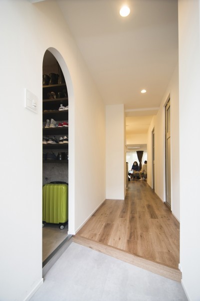 「本当はウォークインクローゼットを作りたかったんですけど、スペースが足りなかったんです。その代わり、お風呂場の脱衣所を広めにして、下着やタオルをしまえるようにしてもらいました。見せる収納は、生活感は出ちゃいますが、綺麗に見せる工夫をするようになるし、扉や壁で部屋が狭くなってしまわない工夫をしてもらいました」(奥様) - 3パントリーやシューズクローゼットの出入り口はかわいらしいアーチ形状11月末に引っ越してきたSさんご一家。