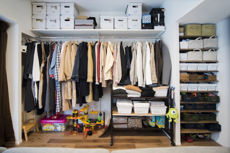 パントリーのほか、シューズクローゼットを設け、リビングや寝室も壁面収納を取り入れています。