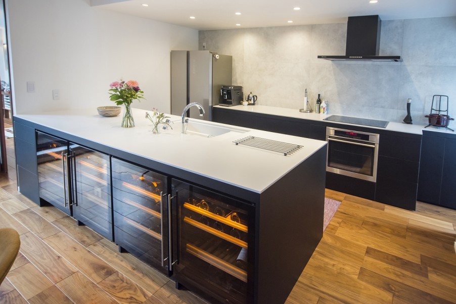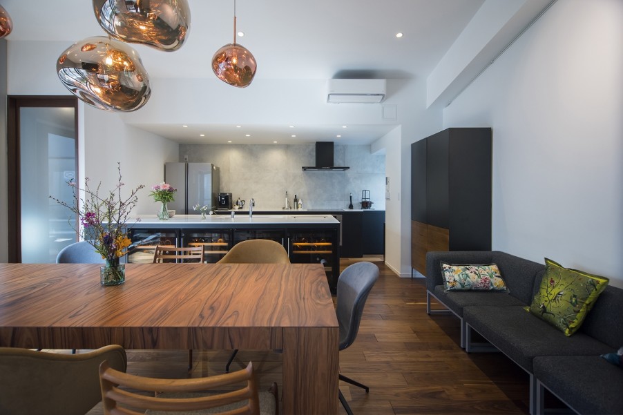 「オリジナルで作ってもらいました。吊戸棚は一切設けずに、収納はすべてカウンターの下に設置しています。キッチンカウンターはかなり広い天板で、ワインセラーは4台すっぽり入るように特注でお願いしました。グローバルベイスの担当さんにもこんなに広いのはやったことがないと言われましたし、エレベーターに入らないので、部材で持ってきて、ここで組み立ててもらいました」(Y様)