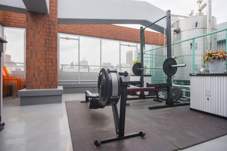 ラウンジは寝る前に読書をしたり、お酒を飲むスペースとのこと。少しずつ、リラックスしながら、眠りにつける動線にしたそうです。さらに寝室側のテラスは筋トレマシンが置かれ、青空ジムスペースになっていました。