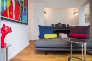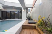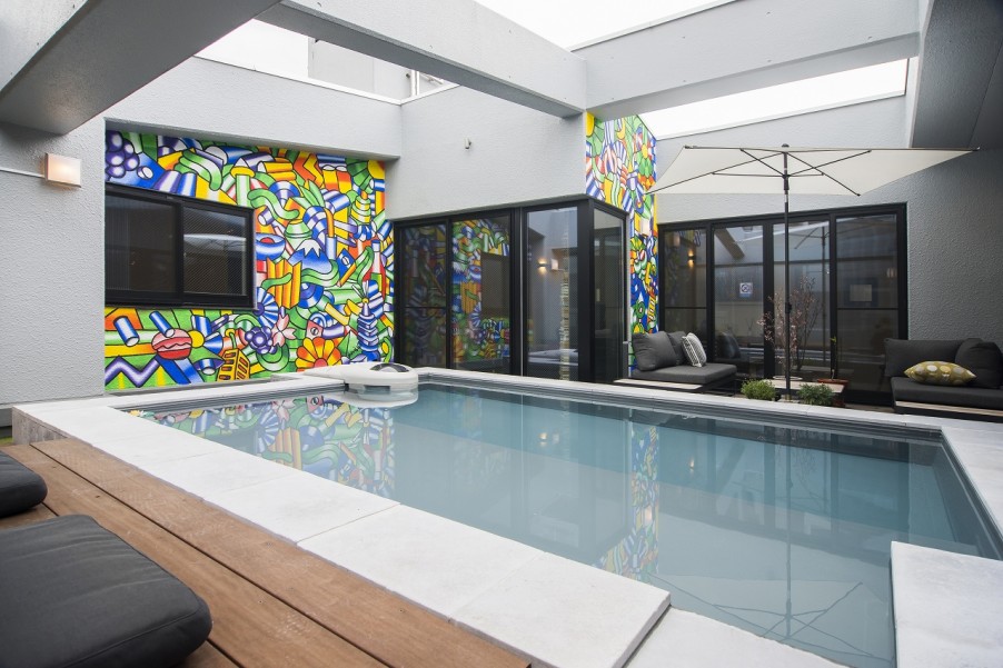 リノベーション前のお部屋は、テラスに池があったそうですが、そこをプールに作り替えられました。そして、壁には鮮やかなアート。アートは水面にも映りどの部屋からも明るい景色が目に入ります。