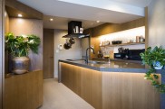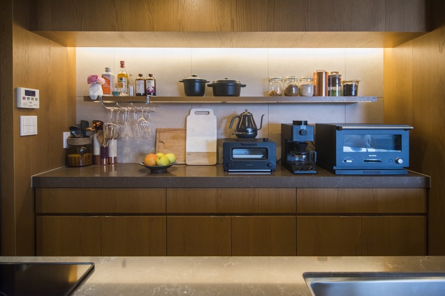 キッチンの棚にも間接照明が設けられていて、並んでいるお酒やキッチンツールに、柔らかな光が当たってとても良い雰囲気です。加えて、引き出し収納には、普通なら気づかないような工夫がされていることに気づいて、感心させられたといいます。