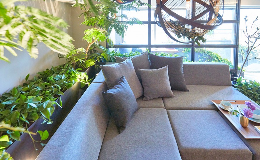 ソファをぐるりと囲む植物に、包み込まれる安心感。