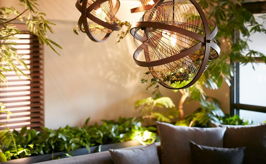 吊り下げ型のプランターと融合した照明。家族の集うダイニングをグリーンとライトで明るく彩ります。プランターは簡単に取り外しができるので、植物を気軽に取り換えてインテリアの雰囲気を変えることができます。