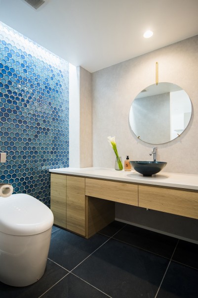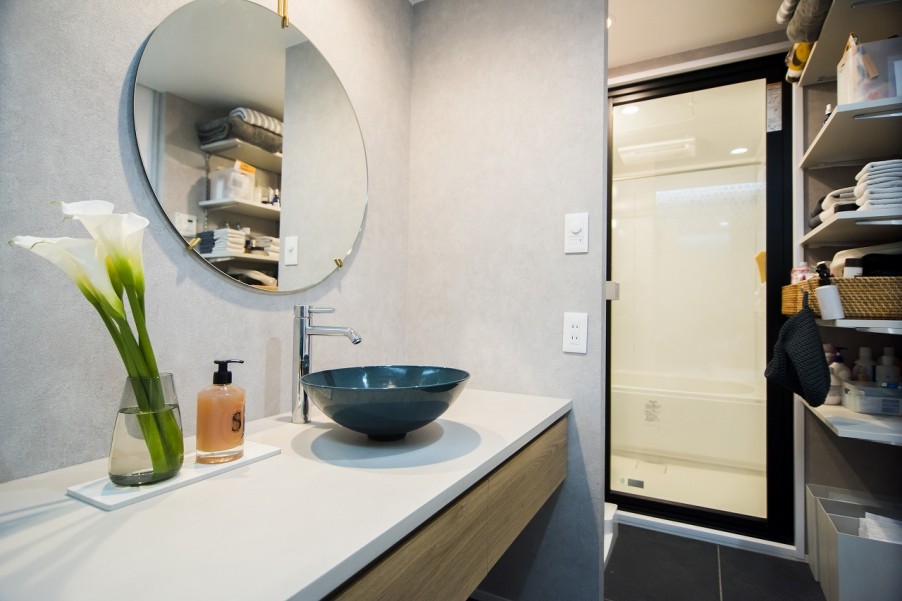 「1つ目は洗面エリアですね。ホテルのような、洗練されて落ち着ける空間にしました。家に帰ってきて手を洗ったり、鏡を前にして化粧水をつけたり…そういうタイミングで気分が上がりますね。打ち合わせで、洗面室で使うタイルを色々と見せてもらいながら選んだのは本当に楽しかったです。気が付いたらあっという間に時間が経っていました。お風呂の扉をプラスチックではなくガラスにしたので、お風呂に入りながら洗面室のタイルが見えて良いですね。Jくんも覗きに来ます(笑)」(Y様)