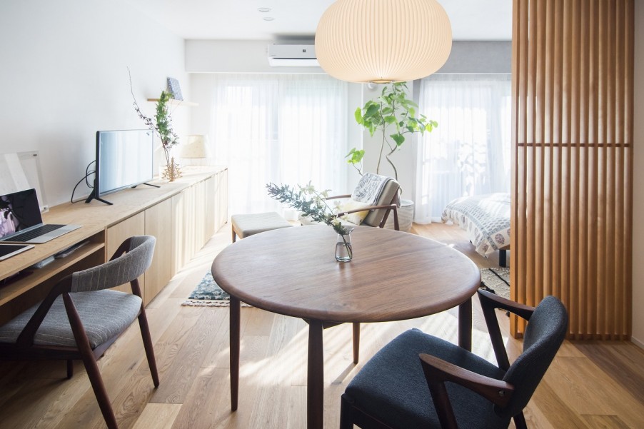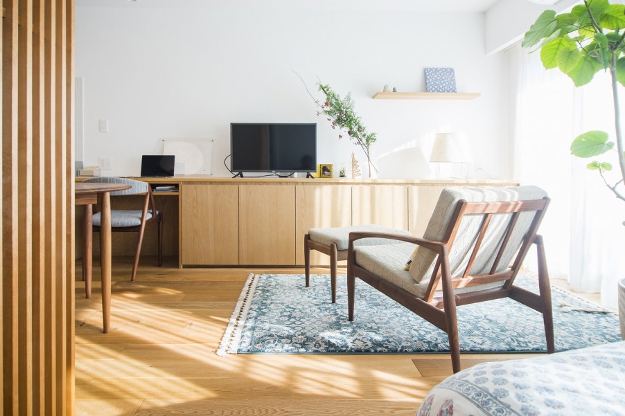 「置ける家具は限られているので、こだわって選びました。ダイニングに置いている椅子はデンマークのデザイナー『カイ・クリスチャンセン』のビンテージチェアで、色々な人が大切に使ってきたものです。ソファも、同じくカイ・クリスチャンセンデザインのものを、宮崎椅子製作所で木材と生地を選ぶセミオーダーで作ってもらいました。造作の棚は塗装をした方が傷はつきにくいですが、木の味わいが楽しめるようオイル塗装のみにしました。床もオイル塗装の無垢材で、棚と同じく人が住んだり陽が当たったりすることで色が経年変化するような素材を選びました。新しくて綺麗というよりは、住んでいる自分の生活の跡が残って、それが味になるような家具や床がいいと思って選びました。」(Y様) - 3これからの20年、30年を生きる場所だから…これからリノベーションを考えている方に向けて、アドバイスをいただきました。