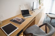 「造り付けの棚は、その会社のショールームに行って、自分の身長と椅子に合わせてベストなサイズで作っていただきました。上部の飾り棚も、私の身長で取りやすい高さで、目線の邪魔にならないようにしています。」(Y様)