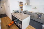 「2つ目は、持っている家具と犬のケージをどこに配置するかですね。図面を見るとわかるのですが、廊下側とクローゼット側の壁が真っ直ぐではなく凹凸があります。元から持っていた本棚、電子ピアノを置く場所を考慮いただいた結果です。今まで大切に使っていた家具を置きたいけど、設計後の間取りでどう配置するか悩んでいる旨を設計士さんに伝えたところ、それを設計に落とし込んでいただいたことは非常に良かったです。また、犬のケージも、リビング壁面に作り付け棚を配置するため置き場所がなく、相当配置を迷いました。設計士さんからキッチンカウンターの下を提案していただいて、ここもこだわったポイントです。」(Y様)