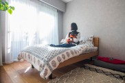 「3つ目は、壁で区切るのではなく、異なる素材の壁や格子を用いることで、窓からの光を遮らずに寝室とリビングダイニングの空間を分けたことです。壁は、リビング側が白の漆喰で、寝室側をグレーの壁紙にしました。格子も使いたいと伝えると、仕切り部分が全部格子になっている1LDKや、クローゼット側に扉があって出入りできるパターンなど、設計士さんが色々なパターンを作ってくださって面白かったですね。最終的に、玄関から見たときに寝室が見え過ぎず、ベランダから差し込む光を上手く取り入れることができて、廊下からの見え方も気に入っています。」(Y様)