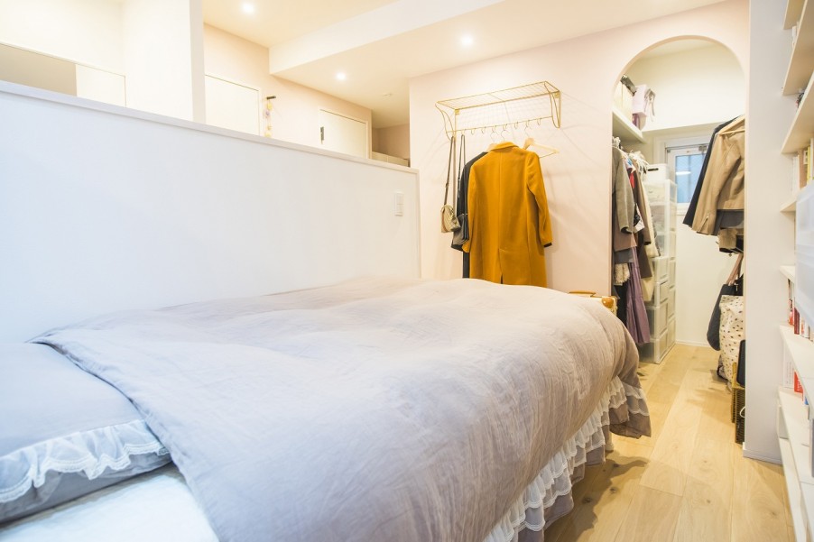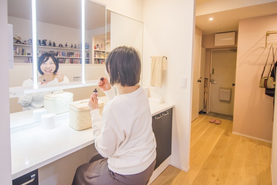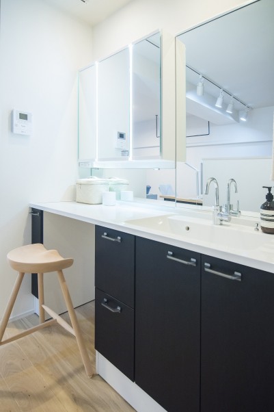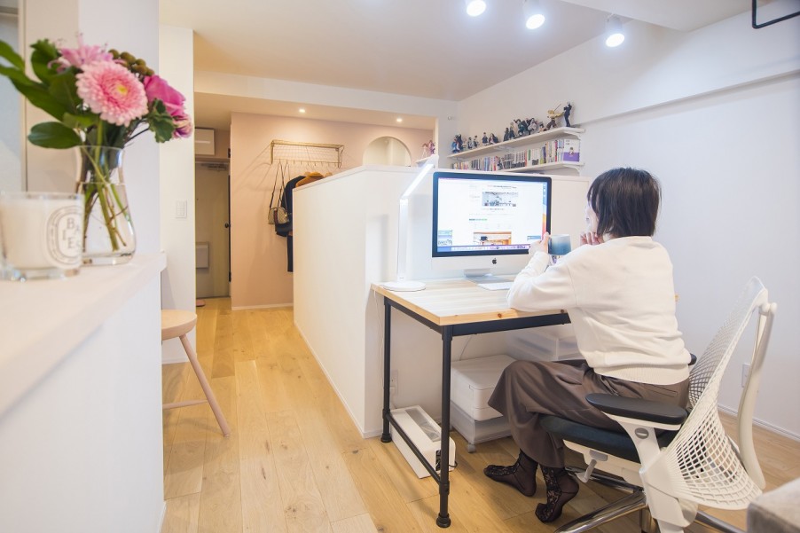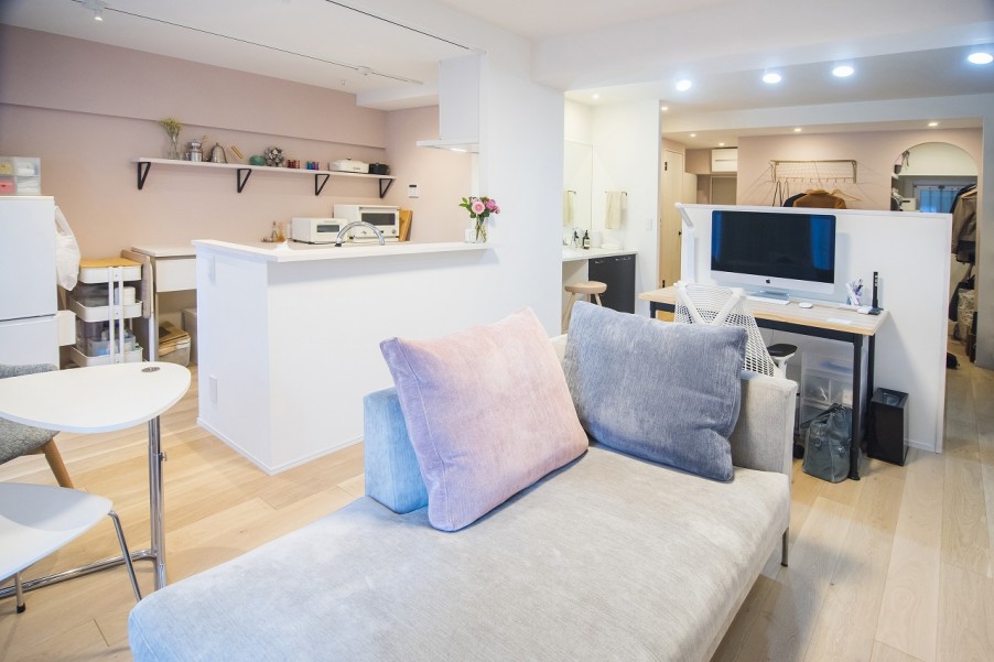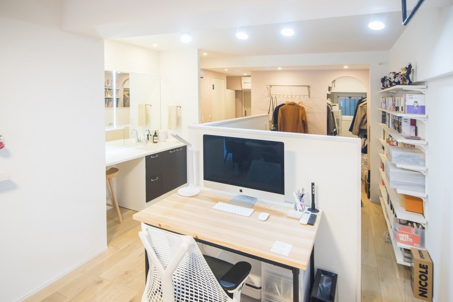 「壁面収納、対面キッチン、洗面台で隣に座れるスペース、パソコンが置けるスペース、ゴルフバッグを置きたい…など、いくつか希望をお伝えしたのですが、最初から希望通りに設計図面が出来上がっていて感動しました。洗面台をリビングに置くという発想はなかったので、とても面白くて新鮮でしたね。キッチンは二人で立っても十分な広さで、料理をしながら椅子を置いて座ることもできます。パソコンの置き場所は、本当に素晴らしい案だなと思いました。設計士さんにアイディアを出していただいて室内の扉を全部取ったのですが、最終的に扉をつけなくて本当に良かったです。ベッドのところは肩までの高さの壁で囲んであり、秘密基地のような空間で壁にもたれて本を読むこともできます。窓際まで座れるソファでくつろいだり、洗面台でTVを観ながら支度ができたり、どこでも落ち着けてポイントが高いんですよね。全体的には狭い方だと思うのですが、余計な空間が一つもないと思います。設計士さんには色々なわがままを申し上げてしまったのですが、毎週打ち合わせをするのは本当に楽しかったです。」(T様)