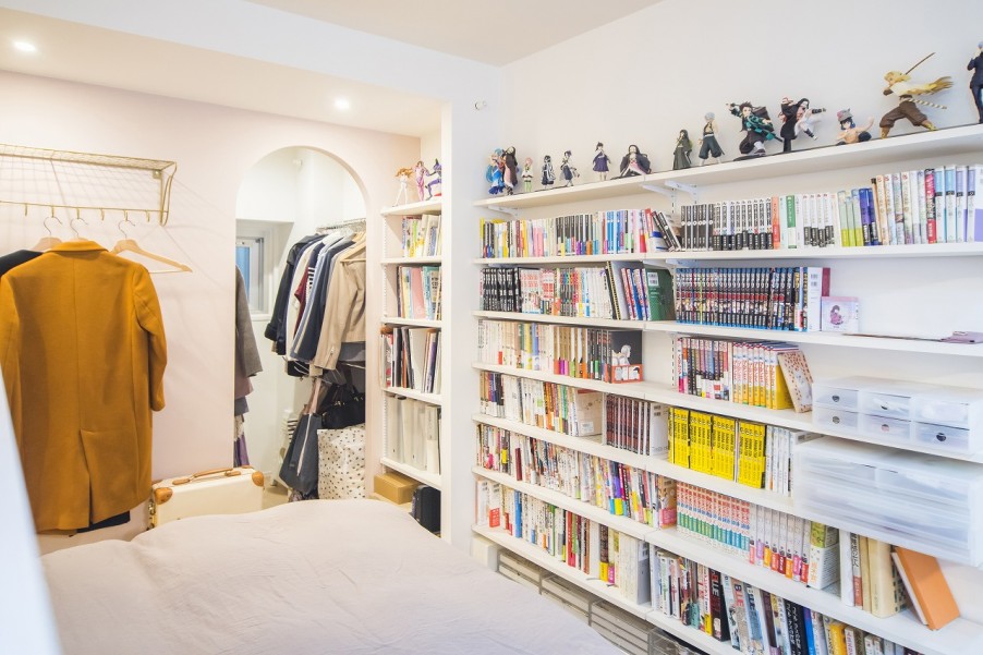 壁一面を有効活用することで大容量の収納スペースを確保でき、お気に入りの本やフィギュアを「見せる収納」や「インテリア」として楽しめるのも嬉しいポイントです。