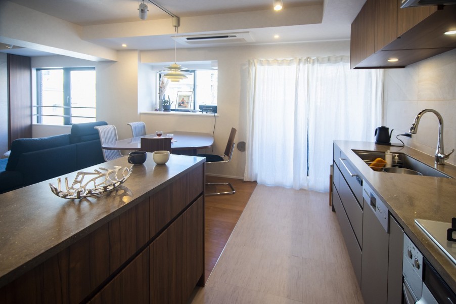 「リビングやキッチン、床の色選びは、置きたいウォールナットのダイニングテーブルに合わせるのが結構難しかったですね。キッチンは、全てにウォールナットを取り入れてしまうと少しうるさい感じになってしまうので、配分を考えて上部の吊戸棚に取り入れました。天板やキッチン本体の色は、設計士さんと見本を床に並べて空間を作りながら比較して選びました。結果リビング全体がまとまって、間取りも使いやすく、とても落ち着く空間になりました。」(奥様)