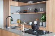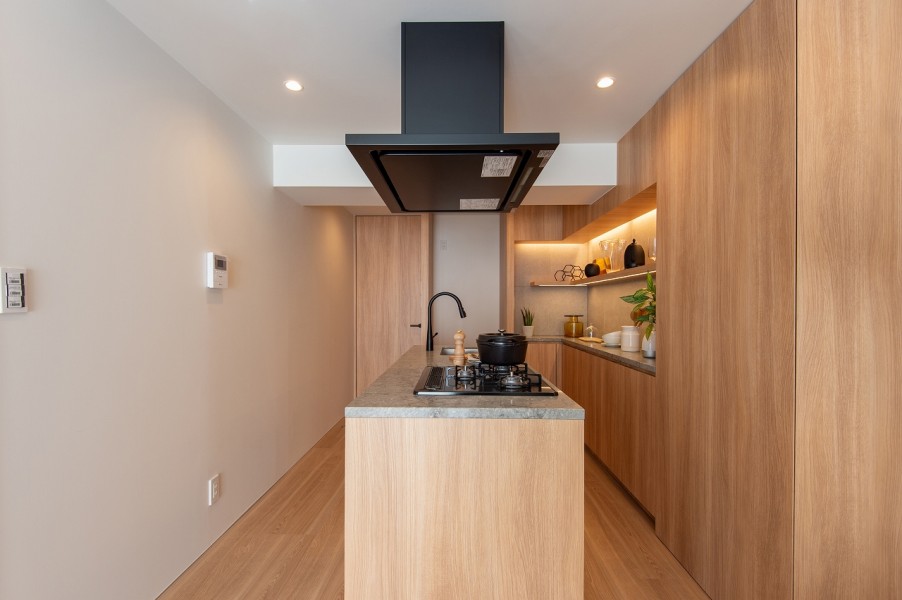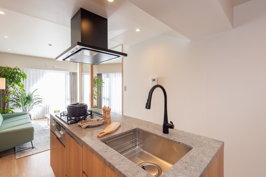 内装面で心に響いたのは「既視感がないところ」だったといいます。室内のドアは天井まで高さがあり開放的で、キッチンやカップボード、洗面台で使われている天板や水栓の素材が統一されています。あまり多くの色を使わず統一感がある点も、これまで見た物件では無かったポイントでした。