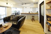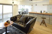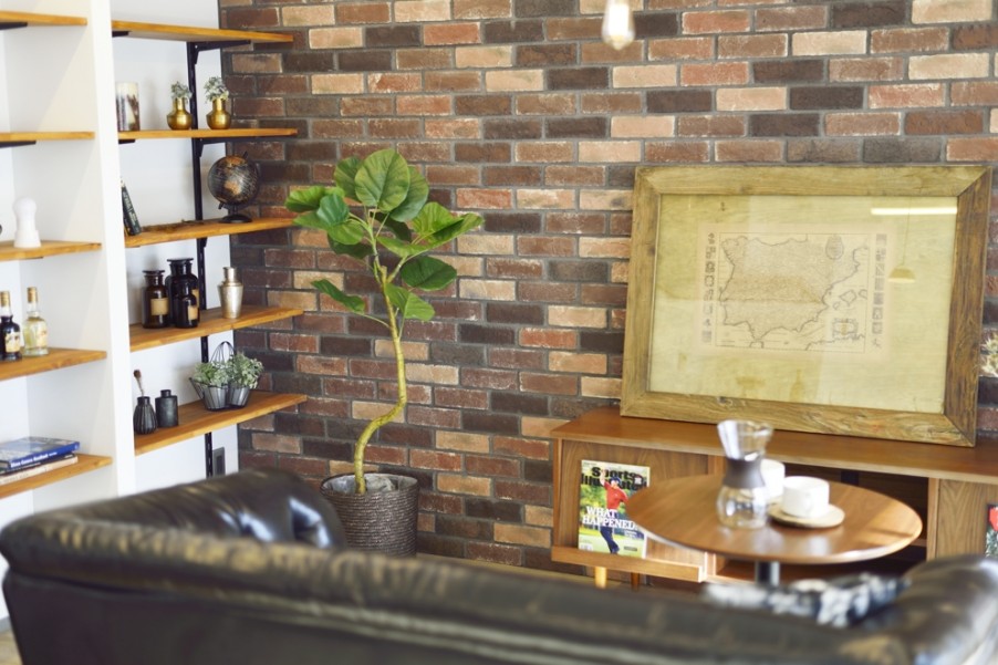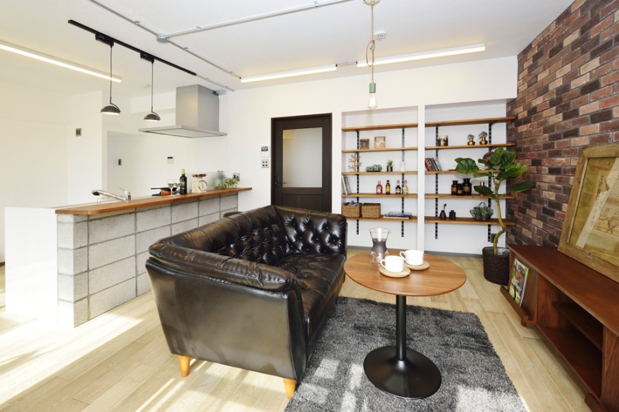 - 1全体をヴィンテージスタイルに床はダメージ感のあるオークの無垢フローリングを使用し、リビングの壁面に茶系のブリックタイルを施すことにより、ヴィンテージ感を演出しました。
