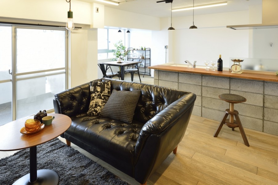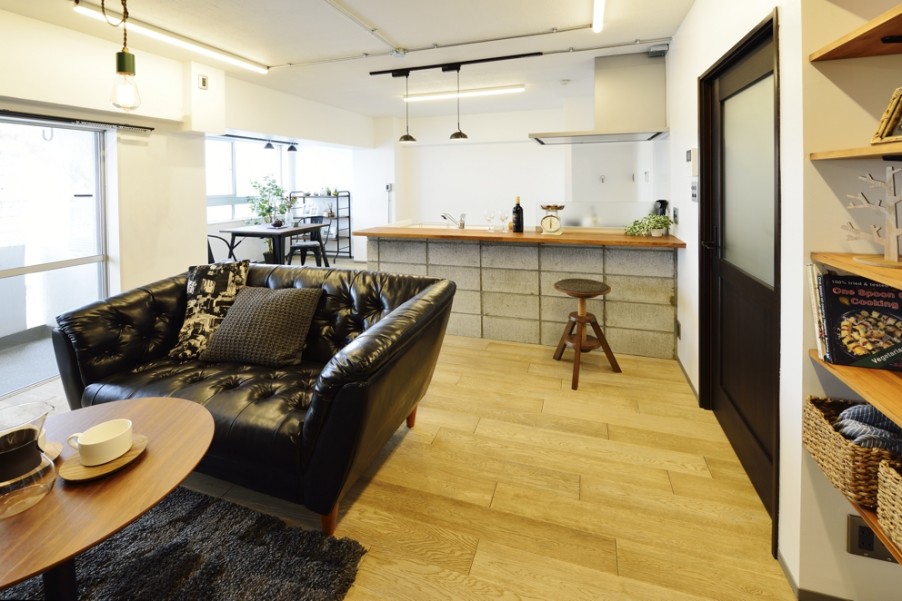 50平米という空間にヴィンテージ感を出しながらもいくつかの工夫を凝らし個性的な空間に仕上げました。ダイニングスペースは南向きの腰窓からの採光で明るい空間へと変わりました。