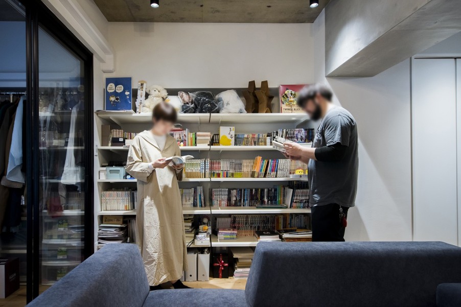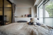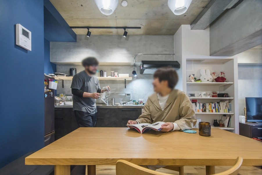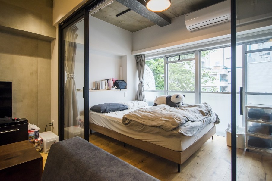 「部屋ごとに壁を作ってしまうと、一部屋あたりの面積が狭くなってしまうため部屋を仕切る壁は取り払いました。寝室とリビングはガラスの引き戸で仕切り、寝室の窓からリビングにも日の光が入るようになっています。