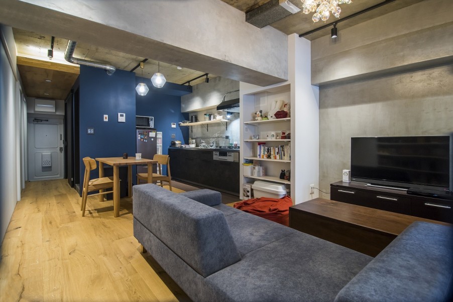 寝室のクロスを白、リビングダイニングをモルタルのグレー、廊下や玄関のクロスをブルーにすることで、日の光が入る寝室から玄関に向かってだんだんと落ち着いた空間になるよう配色し、寝室・リビングダイニング・廊下の3つの空間を色でゾーニングしています。