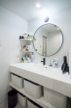 洗面室は、大きな丸い鏡を設計士さんからご紹介いただいて、その鏡を軸にデザインを考えました。洗面台の天板をモルタルで造作することも考えたのですが、クラックが入ったり水シミになったりする心配があったので、機能性と天秤にかけ、汚れが溜まりにくくお手入れが簡単なメーカー製品を自分で見つけて設計士さんにお伝えしました。」(ご主人) - 3街の変化が日々の楽しみに寝室の窓から見えるのは、桜の木です。