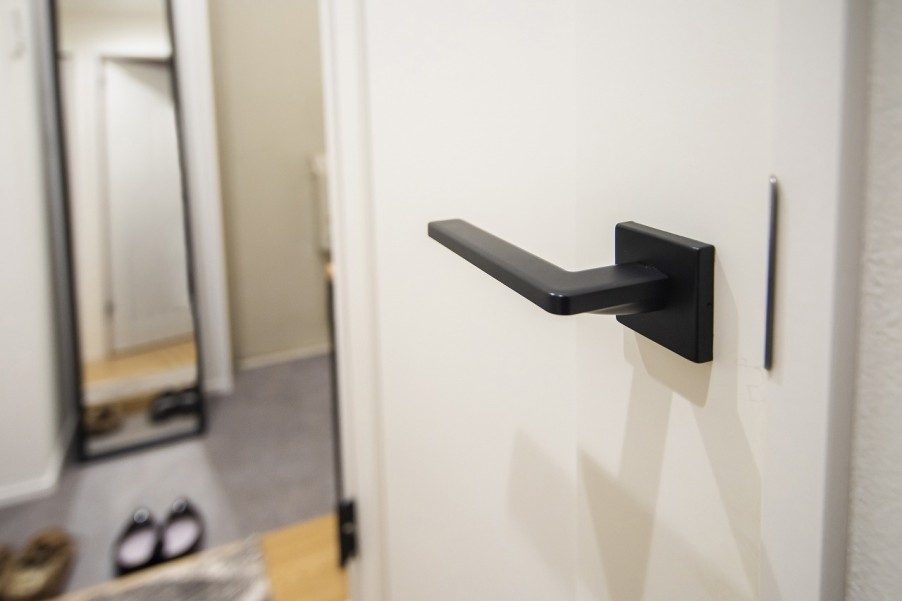 内装は、置きたかったアイアンの家具に合わせて、ドアや収納の取っ手、トイレのペーパーホルダーを黒で統一しています。