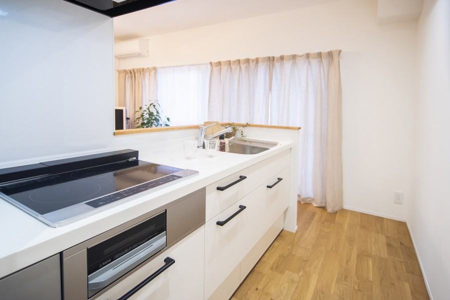リノベーション前は2DKの間取りで、窓の位置を考えるとリビングに入るドアの位置も変えられなかったため、キッチンの配置をどうするか悩んだというO様。