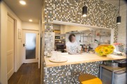 - 2リビングの床材と壁面はタイルで装飾フローリングは天然木のアメリカンウォールナットにより全体を引き締まったイメージにしながらも、キッチン廻りのモザイクタイルなどによりちょっとした遊び心をプラスしました。