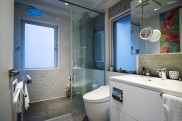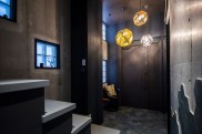 1階の玄関からまっすぐ進むと、大きな浴室エリアがあります。リノベーション前は、広い洗い場にシャワーと一般的なサイズの浴槽があるのみの空間でしたが、リノベーションによってプライベートスパのような空間が完成しました。