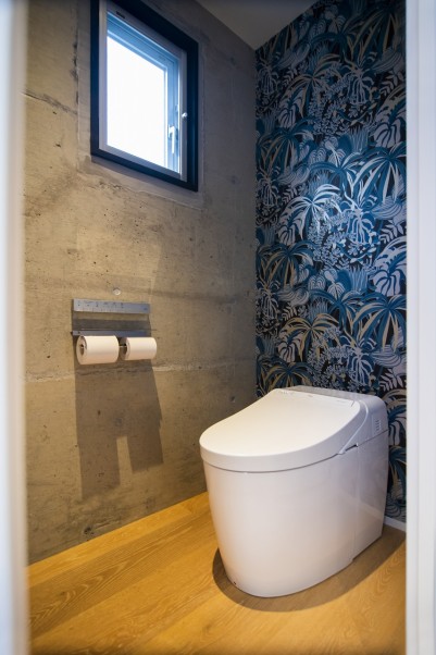「3階の壁は、統一感が出るように色と素材にこだわりました。ソファを置いているリビング側はダークグレー、キッチン側はブルーの壁紙です。ソファがあるリビング側の壁紙をダークグレーにした理由は、窓の枠が一番上まであるかのような錯視を生み出すためです。夜になると、窓枠が天井まであるような雰囲気になります。カップボード側の壁は、対になっている階段側の壁のコンクリートに合うよう、石のようなブルーグレーのタイルを採用しました。」(Y様)