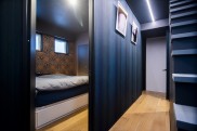 2階には、主寝室と書斎、ゲストルームがあります。各部屋の扉の色を、プライベートスペースは黒、パブリックスペースは白で分けています。光に沿って3階へ行ってもらえるよう、廊下の天井照明は一直線に設置しています。より落ち着いた空間にするため、廊下に黒いカーペットを敷くことを考えているそうです。