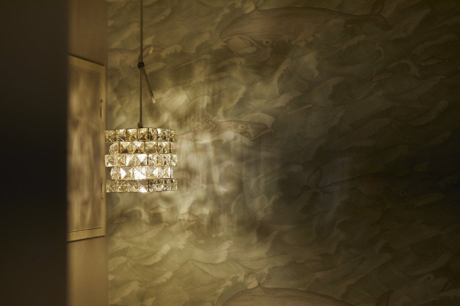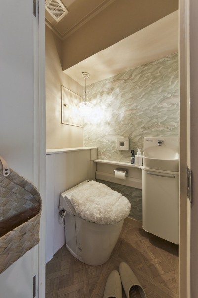 キッチンから窓際の床には塩ビタイルを貼り、フローリングとの境目には真鍮を使用しています。これはA様がグローバルベイスのショールーム「MYRENO OSAKA(マイリノ オオサカ)」でご覧になって、絶対に取り入れたいと思っていたデザインだそうです。耐久性に優れたお手入れのしやすい塩ビタイルの床で、「窓際にお花の植木鉢を置きたい」というご希望も叶えられました。その他にも、どうしても使いたかったという海外製の壁紙をトイレに採用し、照明にもこだわっています。