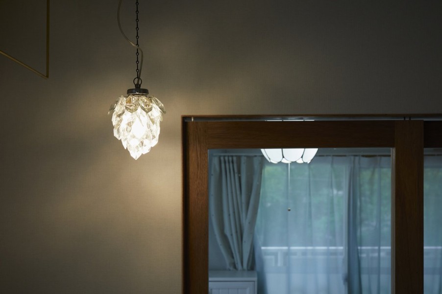 「子ども部屋は、あまり孤立してしまわないようにガラスの間仕切りを希望して、この造作引き戸にしていただきました。将来プライバシーが確保できるように、内側にはカーテンレールも取り付けています。照明は花のつぼみをイメージしたデザインのものを、窓際のカーテンは娘たちが自分で選んだものを取り付けています。」(A様) - 2お気に入りを詰め込んだ最高の家