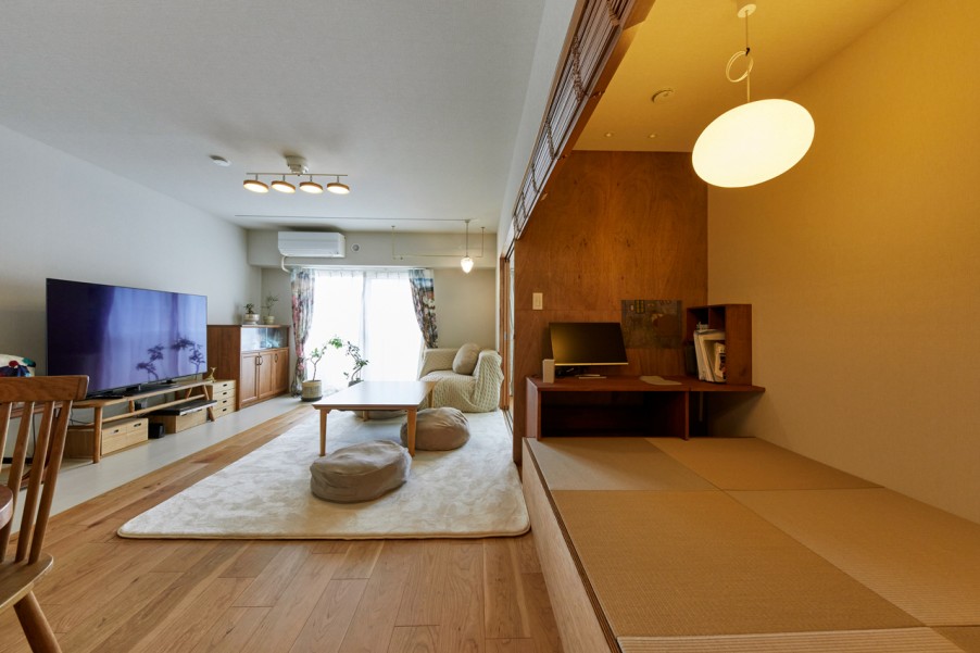 「子ども部屋の他に、仕事ができるスペースも作って欲しいとお願いしたところ、小上がりを提案していただきました。畳を取り外すと収納になっていて、壁際のデスクは移動させることができて便利です。丸い照明もこだわって探したもので気に入っています。」(A様)