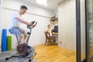 リノベーション後は部屋数としては1つ少なくなりましたが、その分各部屋を広くとり、土間を造ることにより洋室2の利用価値も高めました。 - 3玄関にもつながる土間は、自転車も置け、ちょっとした作業もできる多目的空間だ。トレーニングマシンを置いたり、ヨガをしたり、と大活躍です。