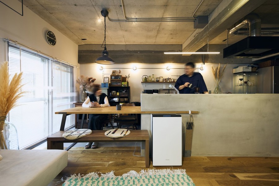 内装はコンクリートや木材などの素材感を活かし、奥様の実家で使われていた窓を再利用したほか、リビングの引き戸は特注した古材パネルやガラス、アイアンで造作しました。